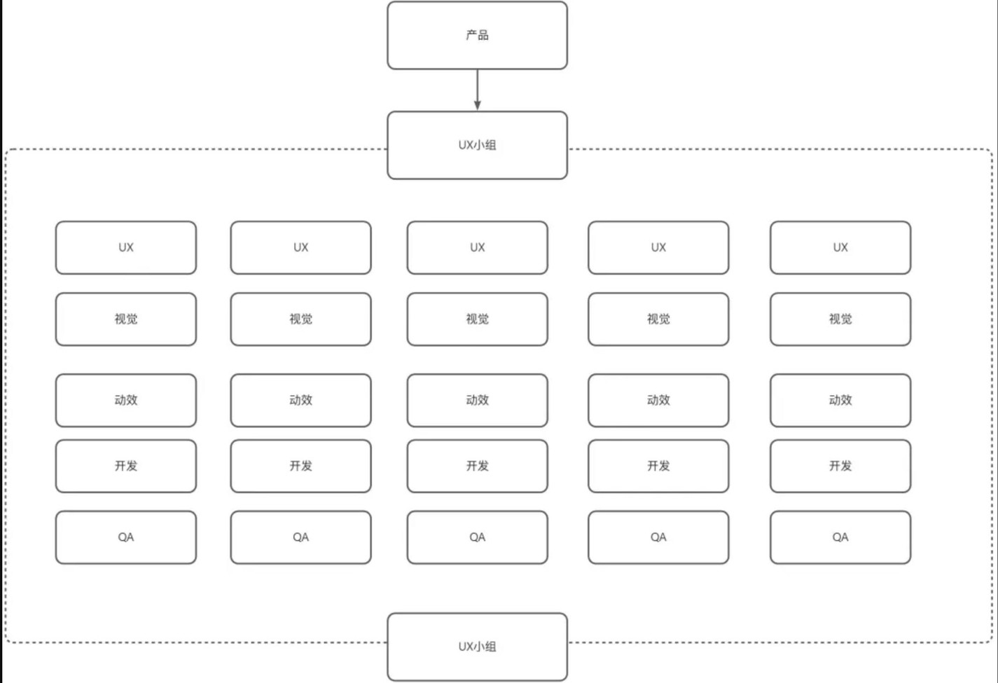 UX、动效、视觉三个小组相对平均分配到5条产品线上,即每条产品线都有1名UX,1名动效和1名视觉(以现有人员数来看,有人需要负责一条以上的产品线)。