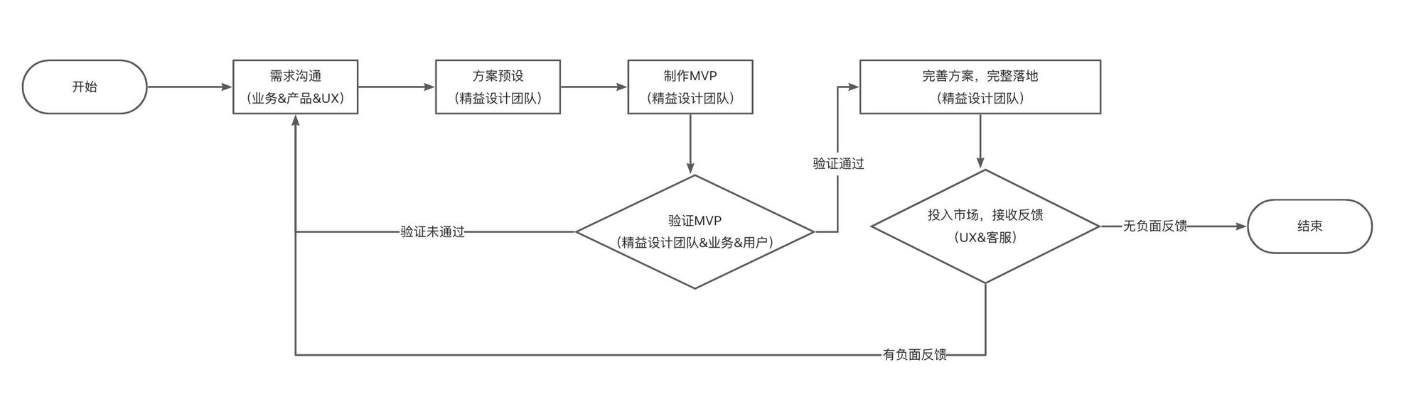 ①流程:UX提前介入,与产品共同参与业务需求调研/沟通环节;产品定义范围层后,由UX作为主导,邀请涉及到的跨职能协作成员进行脑暴,根据业务诉求基于自身专业方向给出设想,形成方案,并制作MVP,并快速投入实验进行验证,最后由UX收集反馈洞察问题,反馈给整个跨职能协作小组,根据调研结果进行迭代或方案完善及完整落地。