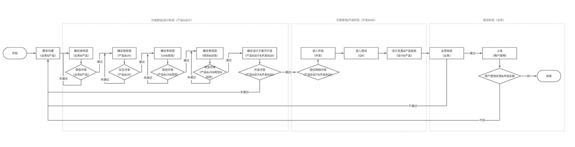①流程:产品给出业务诉求,UX输出交互方案,视觉进行视觉设计,动效基于视觉及交互进行动效设计,开发基于设计方案进行开发,QA进行测试,最后由产品验收上线,面向用户体验。