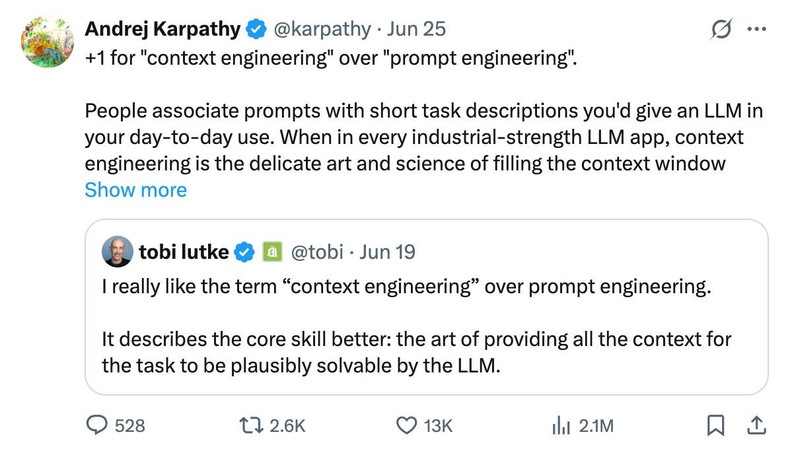 比起“提示工程”(prompt engineering),我确实更喜欢“上下文工程”(context engineering)这个术语。它更好地描述了核心技能:提供完成任务所需全部上下文信息,使大语言模型(LLM)能够合理解决问题的艺术。