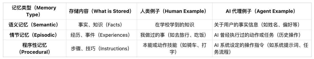 下图是关于三种记忆类型,它把人类的记忆方式类比到 AI Agent 的“记忆系统”中