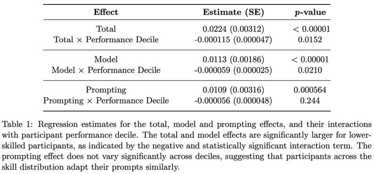 如下表1呈现了「回归分析结果」,测试了模型效应、提示词效应以及总效应是否会在不同技能水平的参与者之间系统性地变化。
