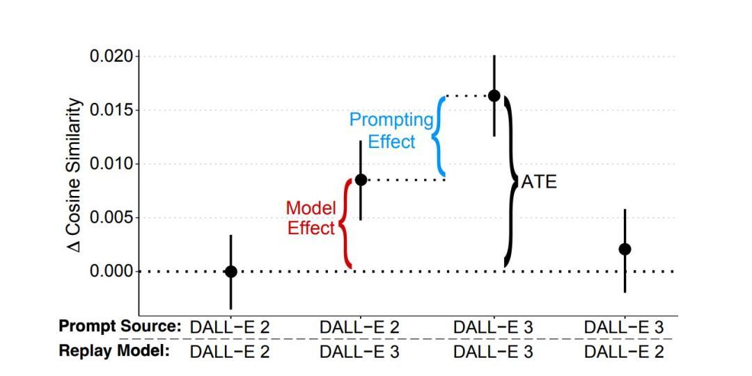 结果显示,相同提示在DALL-E 3上运行时余弦相似度提升0.0084(p