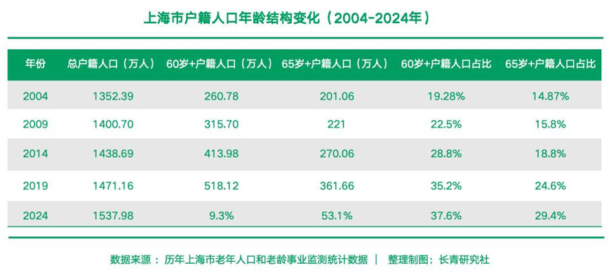 上海民政部门最新数据显示:截至2024年末,上海1538万户籍人口中,60岁及以上人口已达577.6万人,占比高达37.6%;65岁及以上人口也达到452万人,占比29.4%。