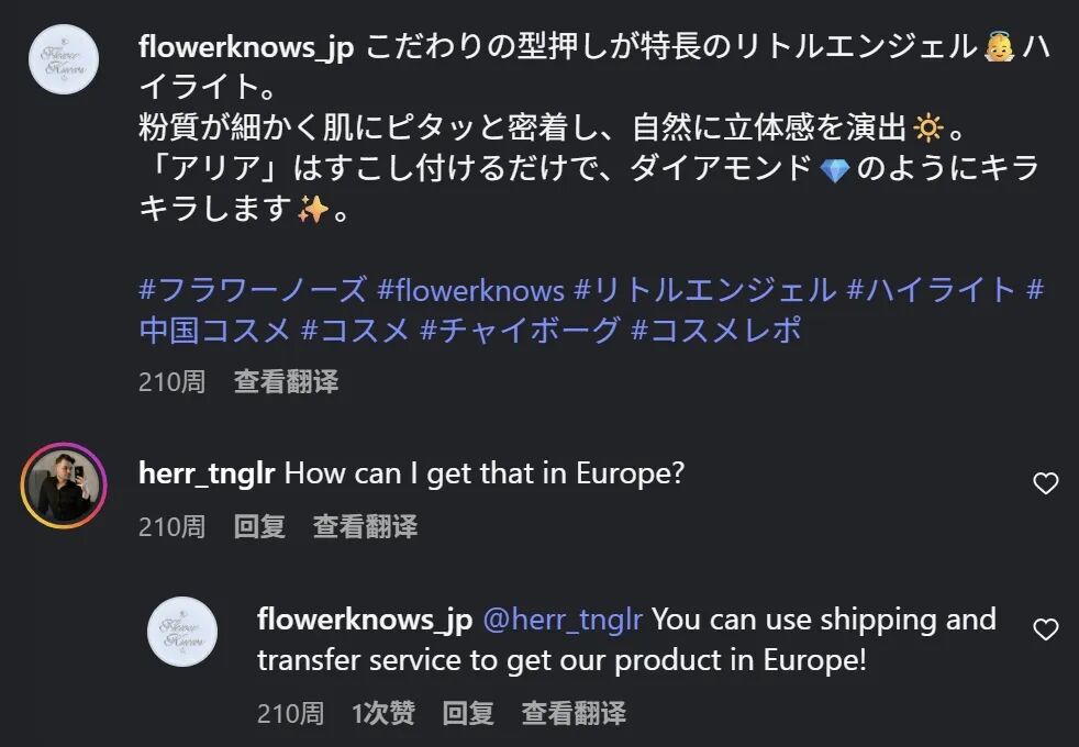 在欧美市场,花知晓同样找到了这样一个市场空隙。众所周知,传统“欧美妆”的定义多是浓颜妆,眼妆、唇妆深色为主,产品外观多是现代极简,和花知晓少女风、清透配色的定位并不匹配。但在2020、2021年花知晓出海日本初期,就有网友在花知晓ins上留言表示希望在欧美能买到花知晓,还有粉丝询问“如何在欧洲购买小天使高光”。