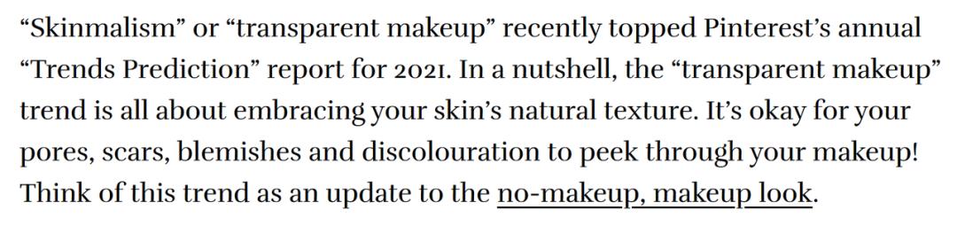 传统认知和用户需求的反差,背后是欧美年轻人的美妆风格偏好在变化。2018、2019年前后,欧美市场开始兴起一股Effortless makeup、Transparent makeup、Natural makeup的风潮,欧美消费者开始偏好更清透、更自然的妆容风格。美国社交媒体平台Pinterest曾经做过一个2021年趋势预测,Transparent makeup高居榜首[1]。