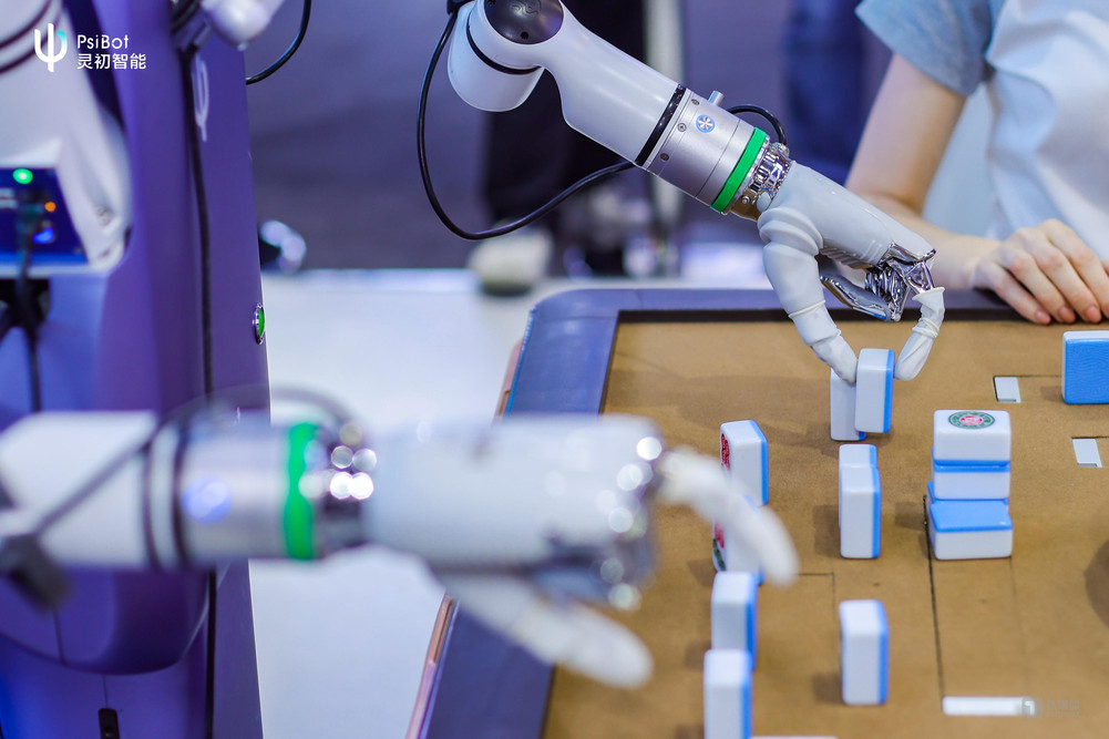 灵初智能麻将机器人与现场观众同桌博弈的场景吸引了众多参观者围观。机器人可与现场观众共同完成30分钟以上的连续麻将对局,以毫米级精度完成摸牌、放置、碰杠等复杂操作,在与人类玩家的实时博弈中展现策略思考,动态构建决策链,自主完成碰杠等博弈决策。观众不仅可以现场观看,更能亲自上桌与机器人对弈,体验机器人如何融合视觉、语言与动作信息,形成游戏博弈和具身操作的融合,展示真正意义上的"会思考的手"。
