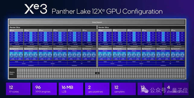 Xe3 GPU提供4核和12核两种配置,12核版本的GPU拥有12个光线追踪单元和96个XMX引擎,还配备了16MB的L2缓存。