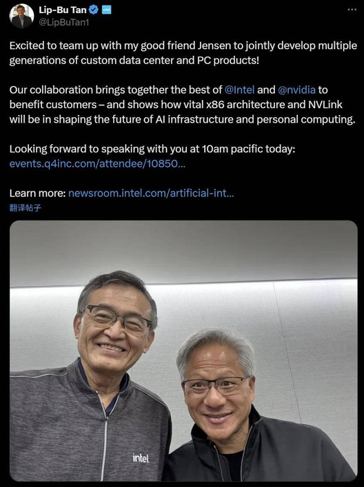 英特尔 CEO 陈立武在 X 上发出了自己和黄仁勋的合影,并表示很高兴能与自己的好朋友合作开发多代定制数据中心和 PC 产品。