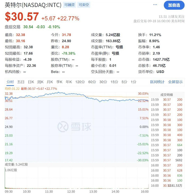 受此消息刺激,在随后开始的交易时段两家公司的股票立即上涨。截至收盘,英伟达上涨了 3.49%,英特尔更是直接暴涨了 22.77%。