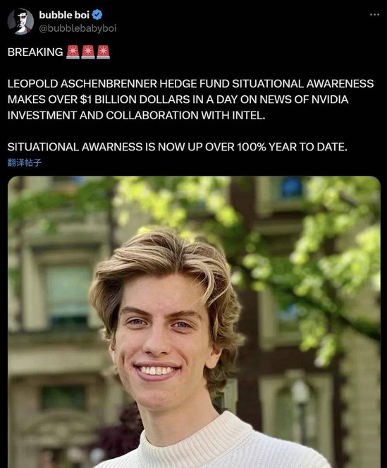 昨天宣布的投资发生后,率先受益的可能是前 OpenAI 超级对齐团队研究员,成立对冲基金的 Leopold Aschenbrenner。他的态势感知基金重仓英特尔股票(第二季度结算占比 20%),据说一天盈利了 10 亿美元以上。