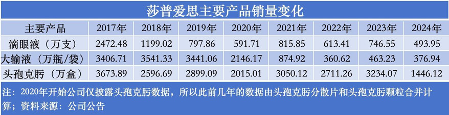 医疗业务不济,莎普爱思原有业务更是持续走弱。尤其是曾经的“神药”苄达赖氨酸滴眼液一致性评价自2017年启动,到目前依然未能完成,该项产品销量也从2017年的2472.48万支减至2024年的493.95万支,贡献的营收从6.85亿元降至1.88亿元,毛利率从93.55%降至69.77%。
