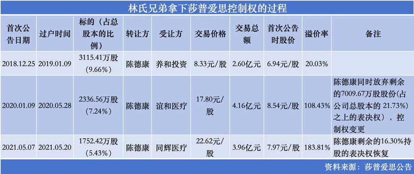 2018年底-2020年初5月,林氏兄弟旗下的养和实业、谊和医疗分别以8.33元/股、17.80元/股的价格受让莎普爱思创始人、原控股股东、实控人陈德康持有的9.66%和7.24%股权,并约定2021年再将5.43%股权转让给谊和医疗或关联方,同时陈德康放弃其所持的剩余股权的表决权。由此,莎普爱思实控人由陈德康变更为林氏兄弟。