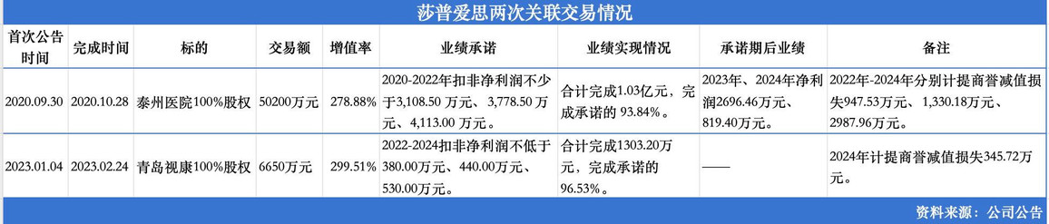 2020年9月30日,公司公告拟溢价278.88%以5.02亿元现金购买林氏兄弟实际控制的泰州市妇女儿童医院有限公司(以下简称“泰州医院”);2023年1月4日,莎普爱思再扔出购买关联资产的公告,公司拟溢价299.51%以6650万元收购青岛视康眼科医院有限公司(以下简称“青岛视康”)100%股权,林氏兄弟的堂哥林长剑通过上海芳芷持有青岛视康20%股权,构成关联交易。