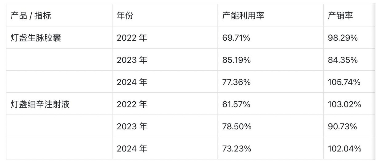 笔者根据2022年-2024年披露的产量、销量及租赁形成的产能计算,公司灯盏生脉胶囊产能利用率分别为69.71%、85.19%、77.36%,灯盏细辛注射液产能利用率分别为61.57%、78.50%、73.23%,并无明显长进。
