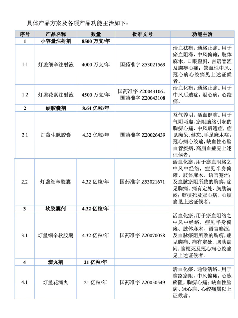 2020年,生物谷登陆北交所,募投项目便是建设云南生物谷大健康产业园项目,以替代租赁形成的产能。该项目预计建设期2年,完全投产后灯盏生脉胶囊、灯盏细辛注射液的年产能将分别达到2400万盒(0.18g*18粒/盒计)和2000万盒(10ml*2支/盒计)。