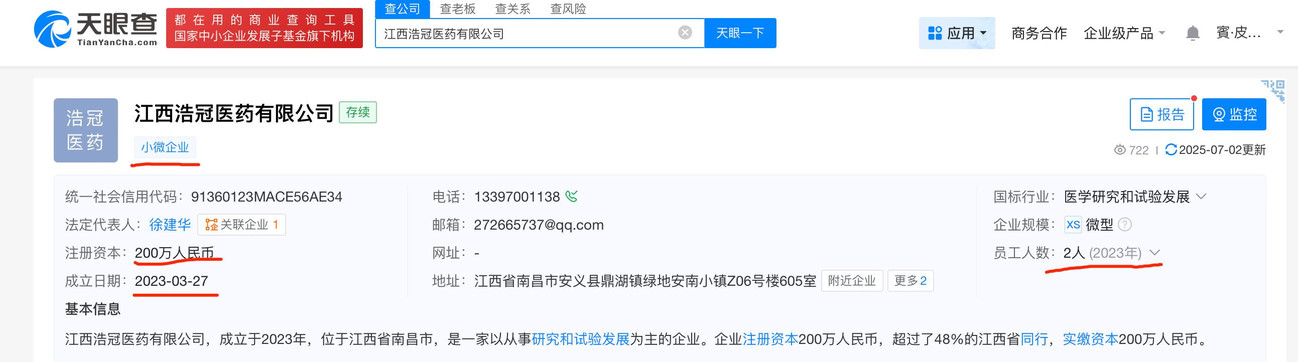 然而,天眼查显示,其中的江西浩冠医药有限公司只是一家成立于2023年3月的小微企业,注册资本仅200万元,且2023年员工2人。
