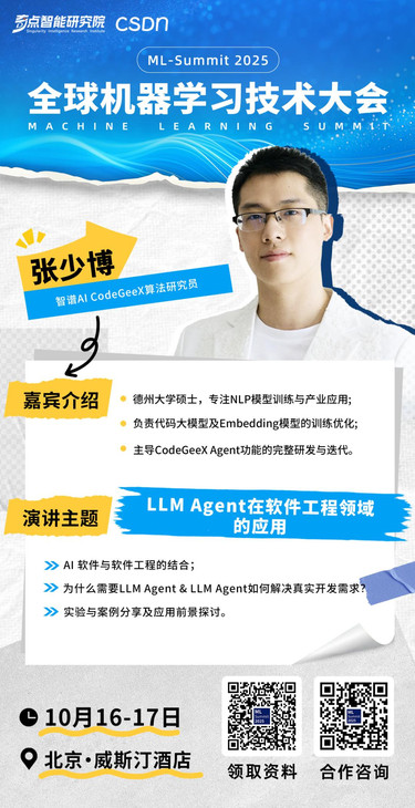 在软件工程领域,如何让人工智能真正参与到实际开发和维护中,一直是核心挑战。智谱 AI CodeGeeX 算法研究员张少博长期从事 NLP 研究,专注模型训练及应用落地。他于 2023 年加入智谱AI,负责 CodeGeeX 代码模型与 Embedding 模型训练,并主导了 CodeGeeX Agent 功能的研发与迭代。