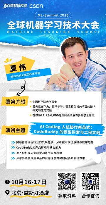 在智能编程的浪潮中,如何实现人机高效协作,成为大模型落地的重要课题。来自 腾讯的夏伟,中国科学院大学硕士,目前负责 CodeBuddy 代码大模型的产研工作,在大语言模型的研发与应用方面具有丰富经验。
