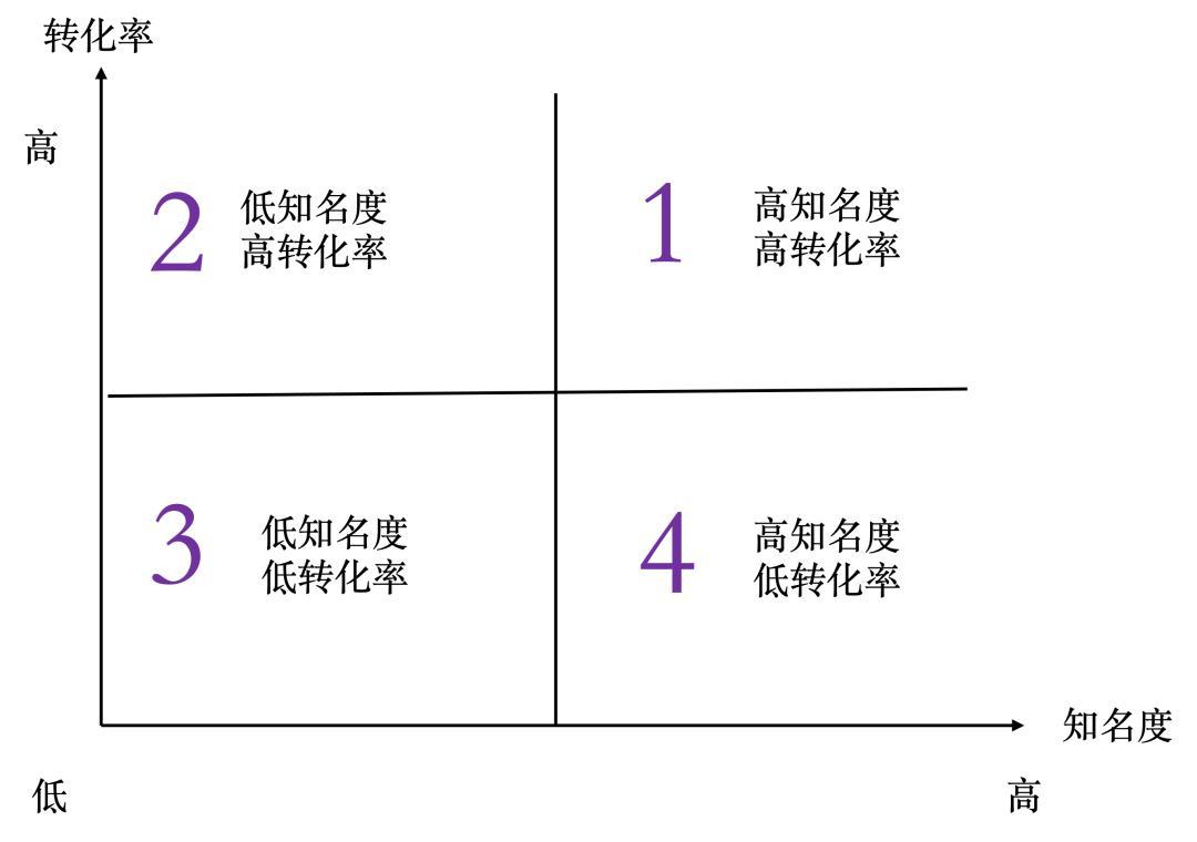 为了更精准地定位企业现状并制定策略,我们可以将上述自查问题映射到“知名度-转化率”的四象限模型中,找到最适合的营销发力点。