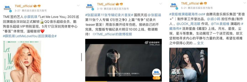 2024 年,张韶涵宣布与 TME 达成深度战略合作,年末即发行个人第十一张专辑《与世之争》;曾调侃自己是 “小众歌手” 的袁娅维也借平台稳定的演出运营与整合营销,在2024年实现个人巡演从千人场到万人场的规模跃升。今年,腾讯音乐又官宣签约薛凯琪,并为其打造十场巡回演唱会,展现出 “版权 + 经纪 + 演出” 三位一体的全链条运营能力。