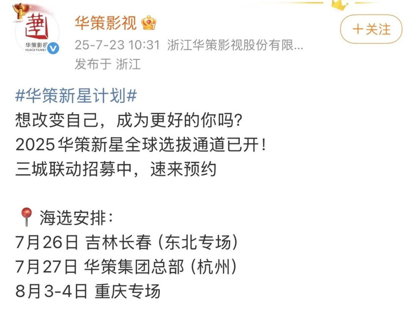 华策则是走起了“产学一体”的艺人培养道路。公司在今年启动的 “华策新星计划” ,面向全球招募14-24岁潜力学员,宣传中强调是“文凭+练习生”的模式,优秀学员可直接进入华策庞大的影视项目池;经过三年系统培养并通过考核者,则签约专属的“未来星经纪中心”,实现从训练、实践到正式出道的全链路闭环。