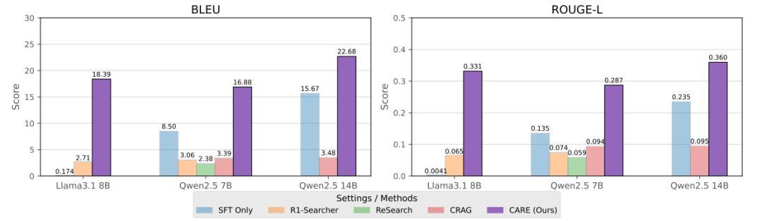 - 检索质量更高:与其他方法相比,CARE 在定位和提取关键支撑事实方面的能力更强,其检索内容的 BLEU 和 ROUGE-L 分数均达到最高。 这证明了 CARE 真正学会了如何在推理过程中精准地“引用”原文,为最终答案的可靠性提供了坚实的基础。