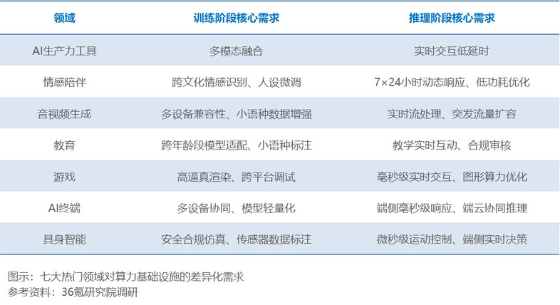 场景定制也是算力解决方案的重要方向。报告对7大热门领域的分析显示,各领域虽在“低时延交互、高弹性调度、异构算力协同、全球化合规”上形成核心技术共识,但因场景特性存在需求分化。训练阶段,AI生产力工具聚焦多模态融合,情感陪伴侧重跨文化情感识别与人设微调,音视频生成需多设备兼容性及小语种数据增强,教育关注跨年龄段模型适配与小语种标注,游戏强调高逼真渲染和跨平台调试,AI终端注重多设备协同与模型轻量化,具身智能聚焦安全合规仿真及传感器数据标注;推理阶段,AI生产力工具追求实时交互低时延,情感陪伴需7×24小时动态响应与低功耗优化,音视频生成看重实时流处理与突发流量扩容,教育聚焦教学实时互动与合规审核,游戏强调毫秒级实时交互和图形算力优化,AI终端需端侧毫秒级响应及端云协同推理,具身智能则是关注微秒级运动控制与端侧实时决策。针对这些特定场景需求,企业需要定制化的算力方案,以确保AI应用的高效运行。