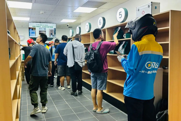 取餐区约十几平米,设有两个出入口:一侧为外卖员取餐区,另一侧为自提区。取餐架上配有0至9号灯箱,骑手或顾客可根据订单尾号在对应灯箱处取餐,以提升效率。