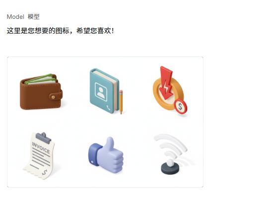 提示词:生成类似风格的 3D 图标,包括:钱包、通讯录、秒杀、发票、点赞、信号