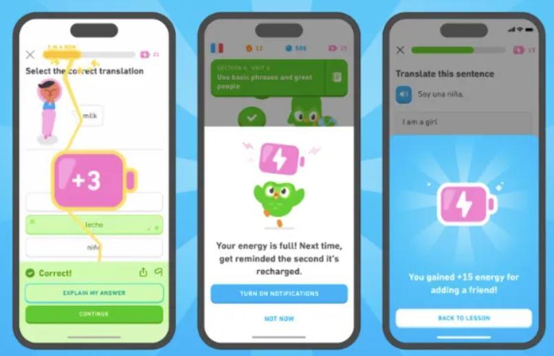 与此同时,Duolingo 将原本的“红心机制”(Hearts System)全面替换为“能量机制”(Energy System), 把学习中的“错误”货币化。