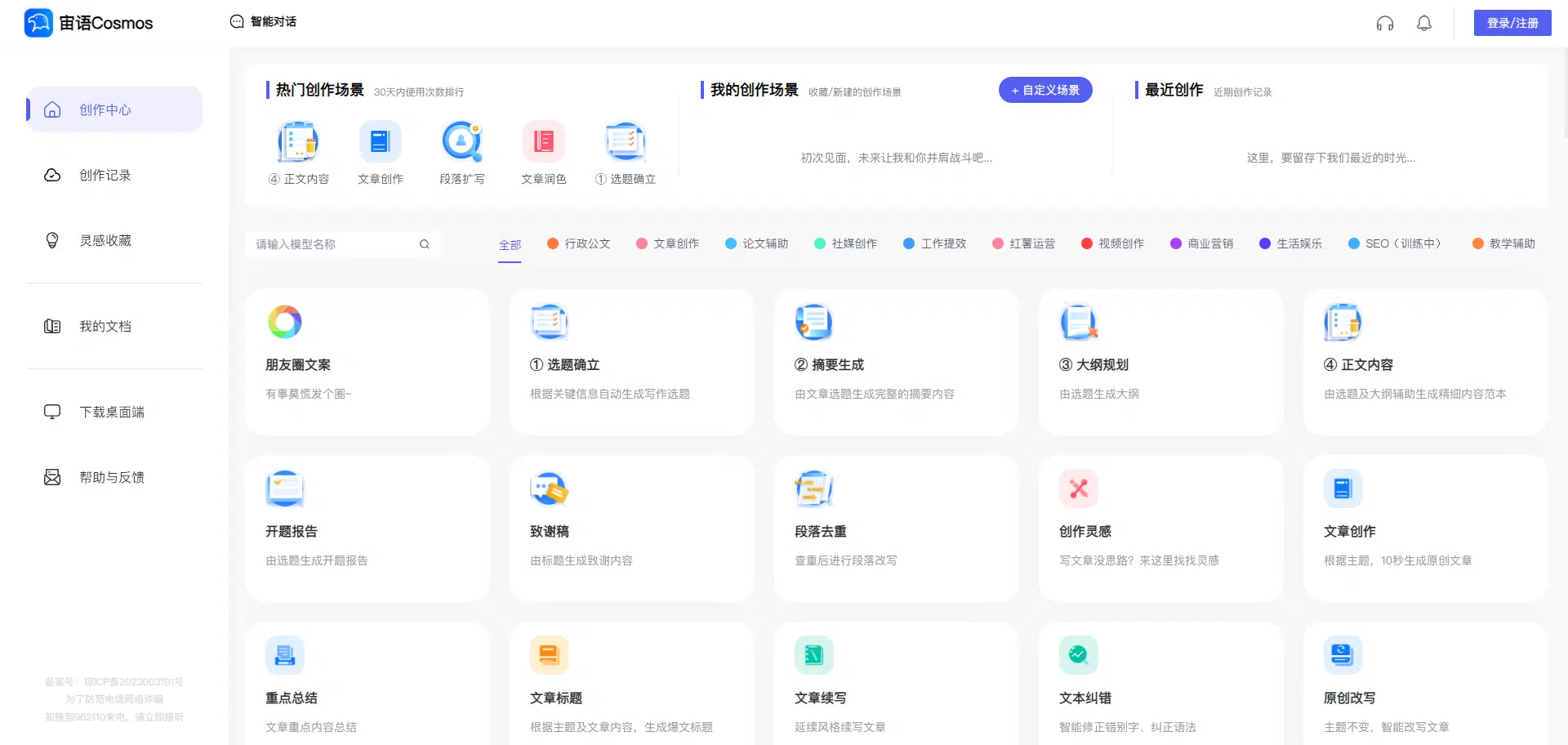 - 多模板创作:为新媒体、市场营销、职场办公、创意写作等场景提供多种实用模板,并基于人工智能技术一键生成。