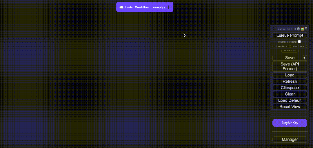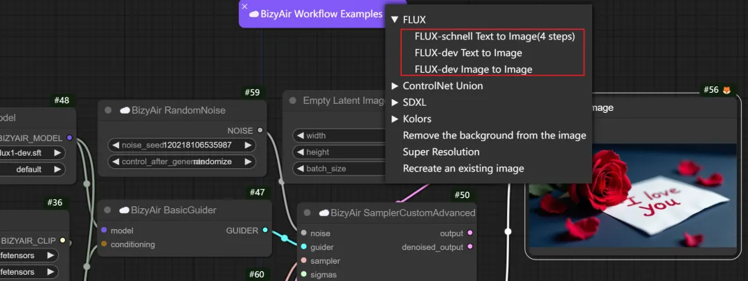 注:需要提前云端注册API KEY,并在本地目录 \ComfyUI\custom_nodes\BizyAir 下,复制api_key.ini.example文件并去掉后缀**.example**。最后打开文件设置自己的云端注册API KEY。Key获取地址:https://cloud.siliconflow.cn/account/ak。