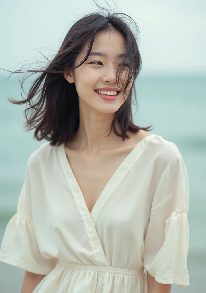chinese girl, Fresh and youthful, 20-old-years, loose-fitting linen dress, natural sunlight, f/5.6 aperture for soft details, overcast day for diffused lighting, ISO 100 for clarity, RAW format for post-processing flexibility, cool white balance for a serene feel, pastel colors, candid expressions, playful hair flip, minimalist setting, leading lines to frame the subject, artistic composition, high aesthetic value, embodiment of spring freshness.