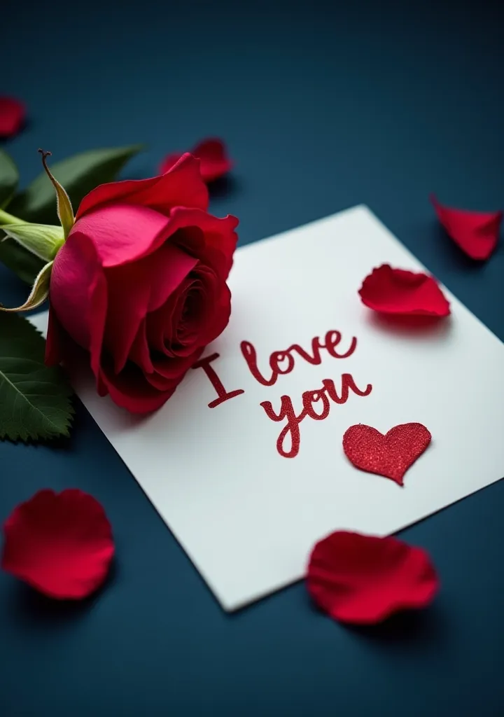 A red rose with the words "I love you" written on it lies next to white paper, with petals scattered around and a dark blue background. The composition is centered in the middle of an ultra-high definition photo, with a close-up shot. It was taken by Sony A7R IV camera using macro lens.