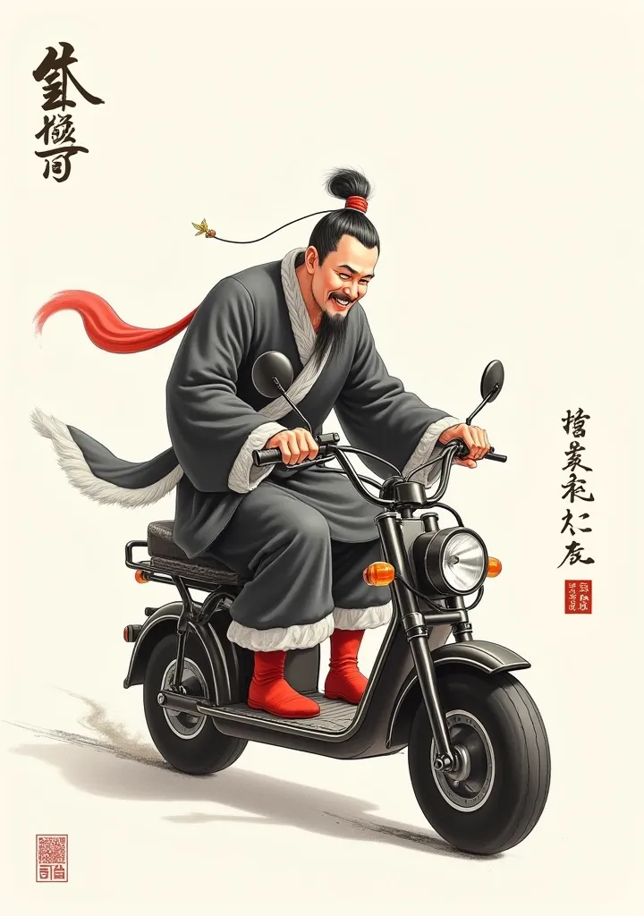 a chinese ink painting, an ancient general riding an electric scooter, wearing black and white pajamas, wearing red boots, holding a red lantern in his hand, and a smiling expression. on a simple background, he has high definition. as a full-body portrait, there is a white space around the head of the character, which has the style of an ancient chinese artist. don"t have any words and numbers on the screen.