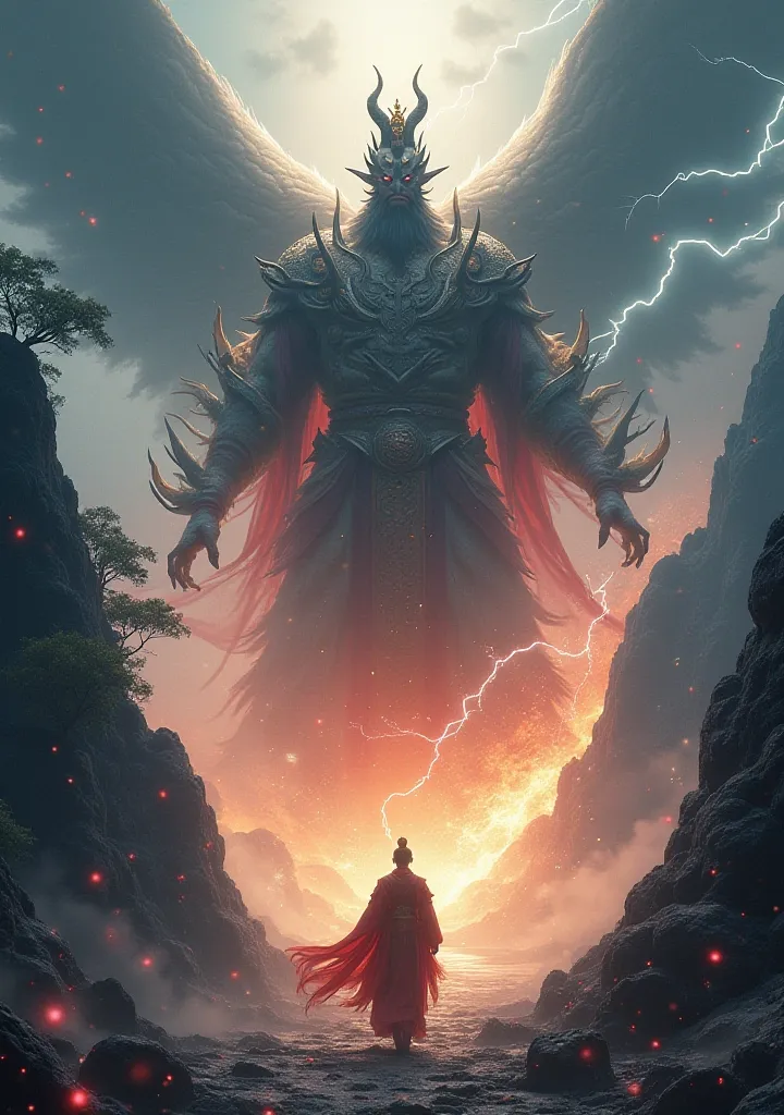 A Chinese immortal descends to earth, splits a monstrous creature, a mysterious glow, a narrow mountain path, amidst thunder and lightning, a majestic bearing, flowing robes, ancient-style attire, stark contrasts, grandeur and momentum, striking battle scenes, awe-inspiring colors, and magical emotions.