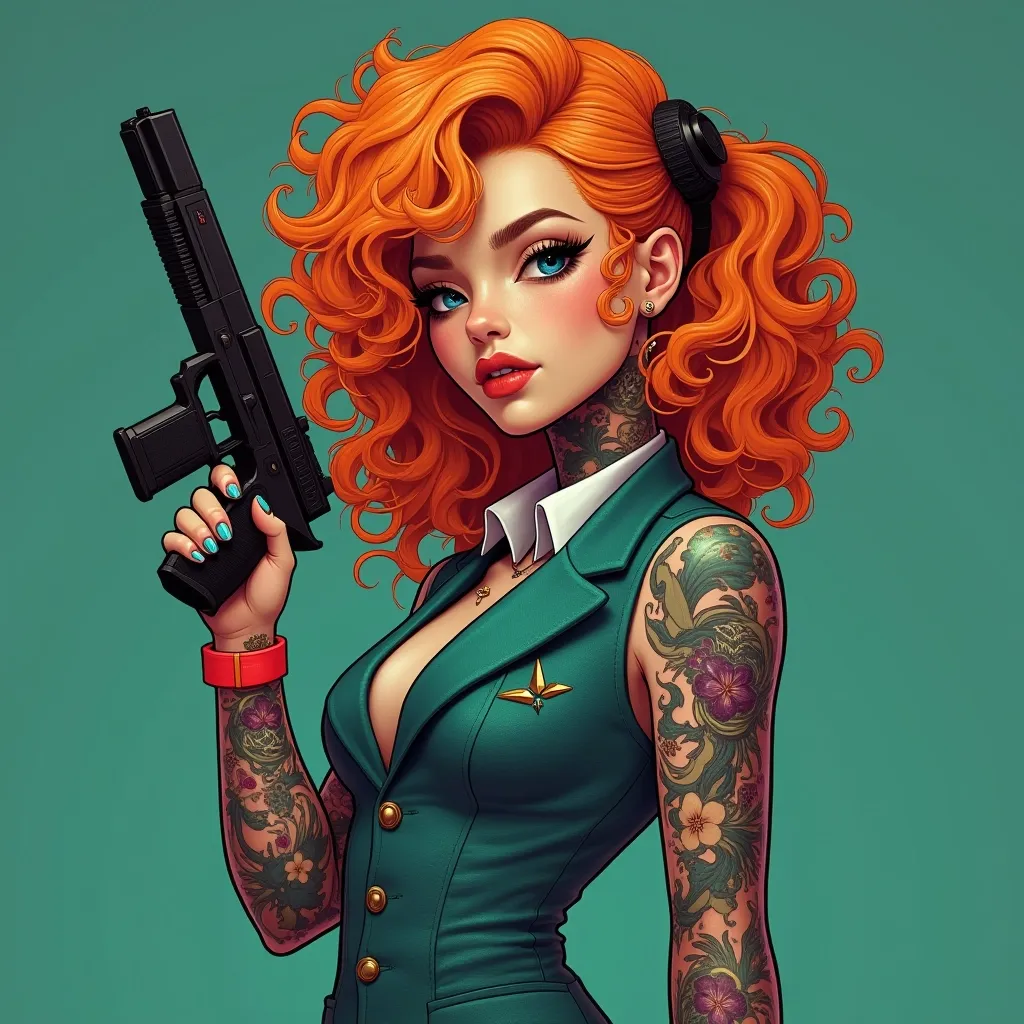 A girl in a suit covered with bold tattoos and holding a vest pistol, beautiful woman, 25 years old, cool, future fantasy, turquoise & light orange ping curl hair