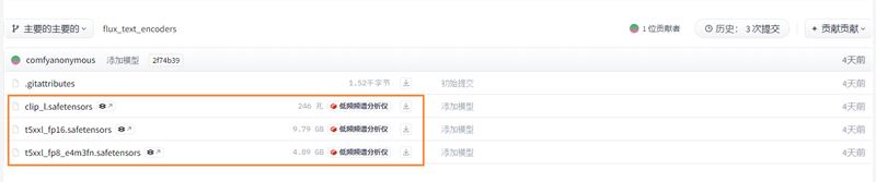 我们除了大模型和Vae还需要下载Clip模型:https://huggingface.co/comfyanonymous/flux_text_encoders/tree/main
