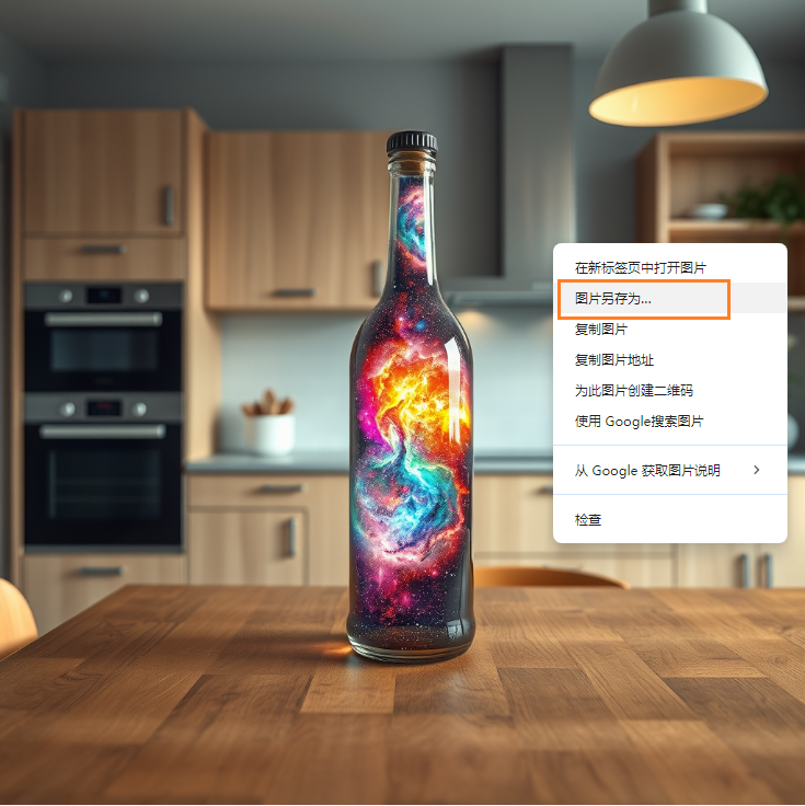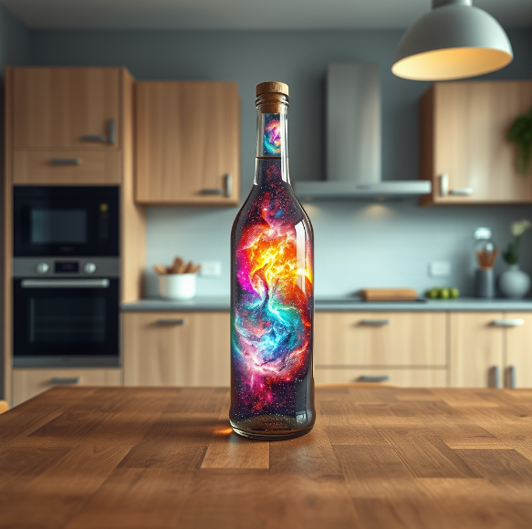 提示词1:a bottle with a rainbow galaxy inside it on top of a wooden table on a table in the middle of a modern kitchen