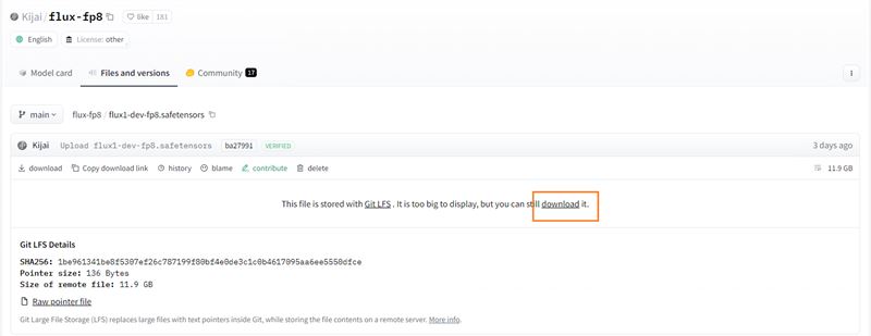 如果电脑配置一般的可以下载Flux-fp8精简版,只有11.9GB:https://huggingface.co/Kijai/flux-fp8/blob/main/flux1-dev-fp8.safetensors