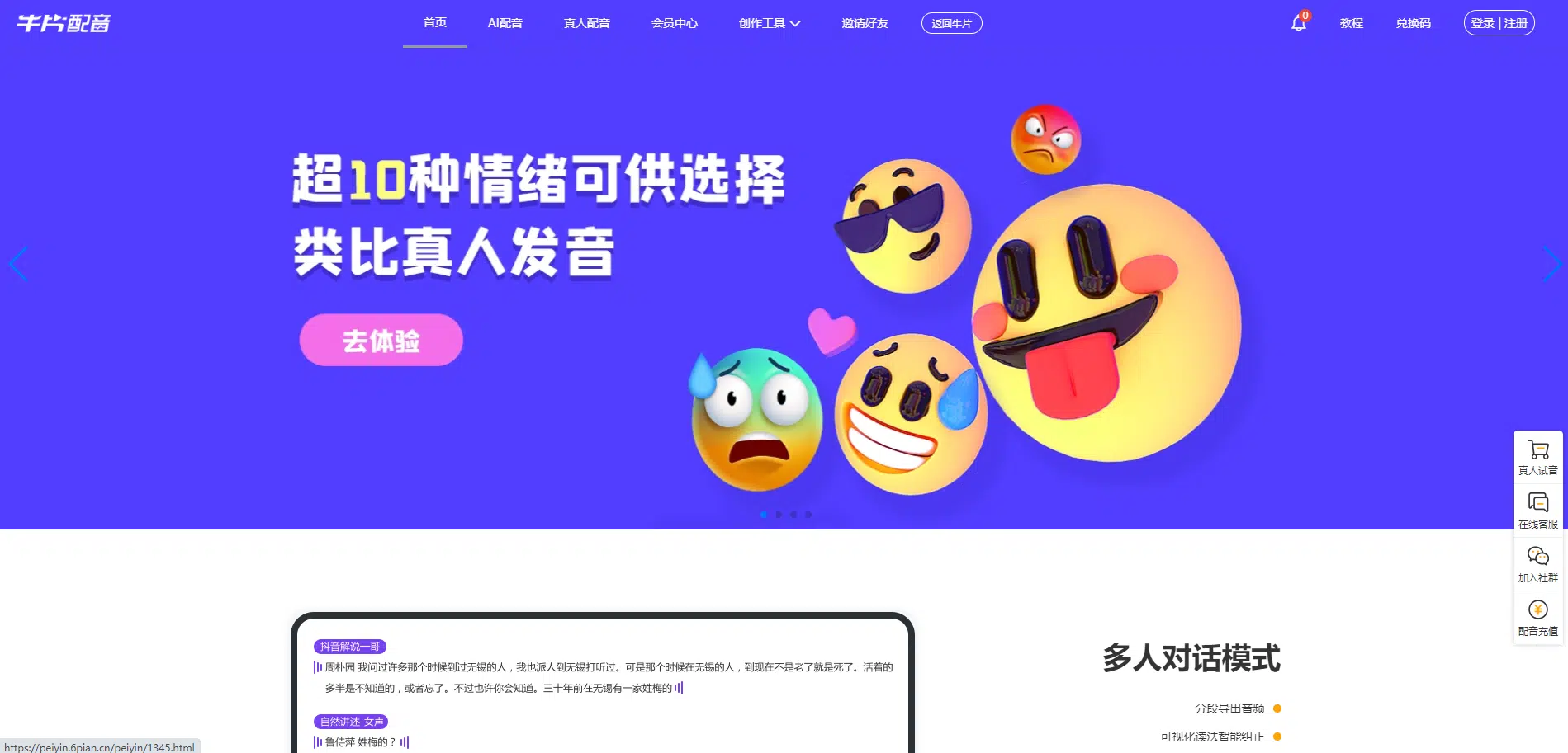 牛片配音隶属于牛片网,是一个专注于服务短视频创作者的 AI 在线配音工具,它的配音功能特别全面,并且专业性很强,效率极高,适合企业和专职博主使用,但同时它的页面优化得极好,新手一看就懂,点击操作非常简单,使用几乎没有门槛。
