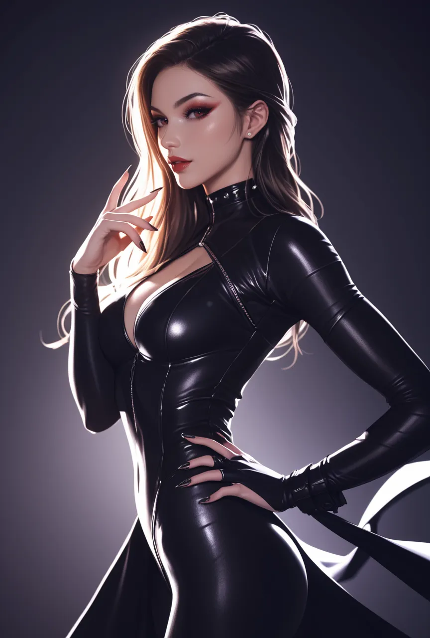score_9, score_8_up, score_7_up, score_6_up, 8k,UHD, 1 super beautiful girl, red eyes, makeup, eyeliner, eyeshadow, mascara, black background, black bodysuit, perfect female waist, suggestive pose, dynamic pose, moonlight,halftone lighting, detailed drawing (perfect hands, perfect fingers) ,side view, perfect lighting, perfect shadows