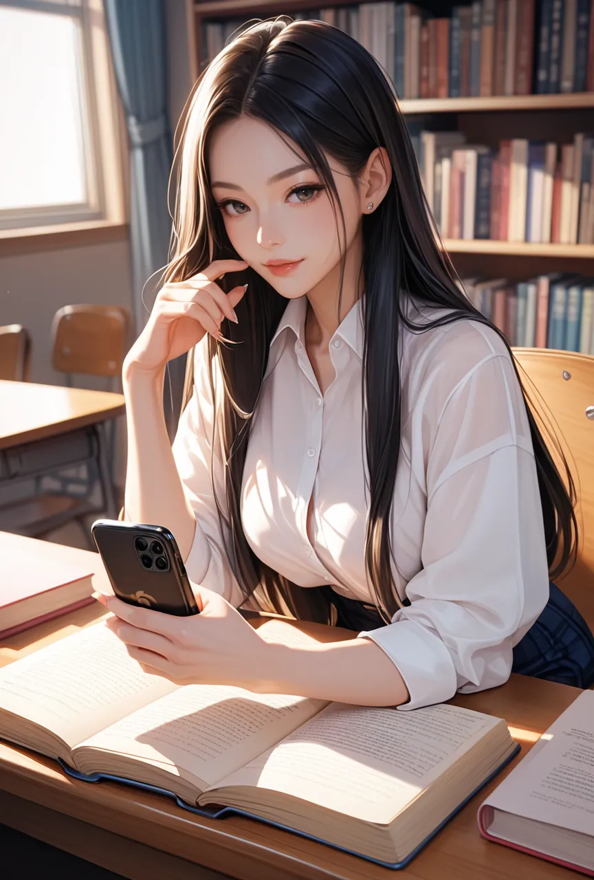 Prompt:score_9,score_8_up,score_7_up,score_6_up,8k,UHD,1 super beautiful girl,long hair,black hair,holding cellphone,looking at the cellphone,front view,library,sitting by a desk,book on desk,rim light,background light
