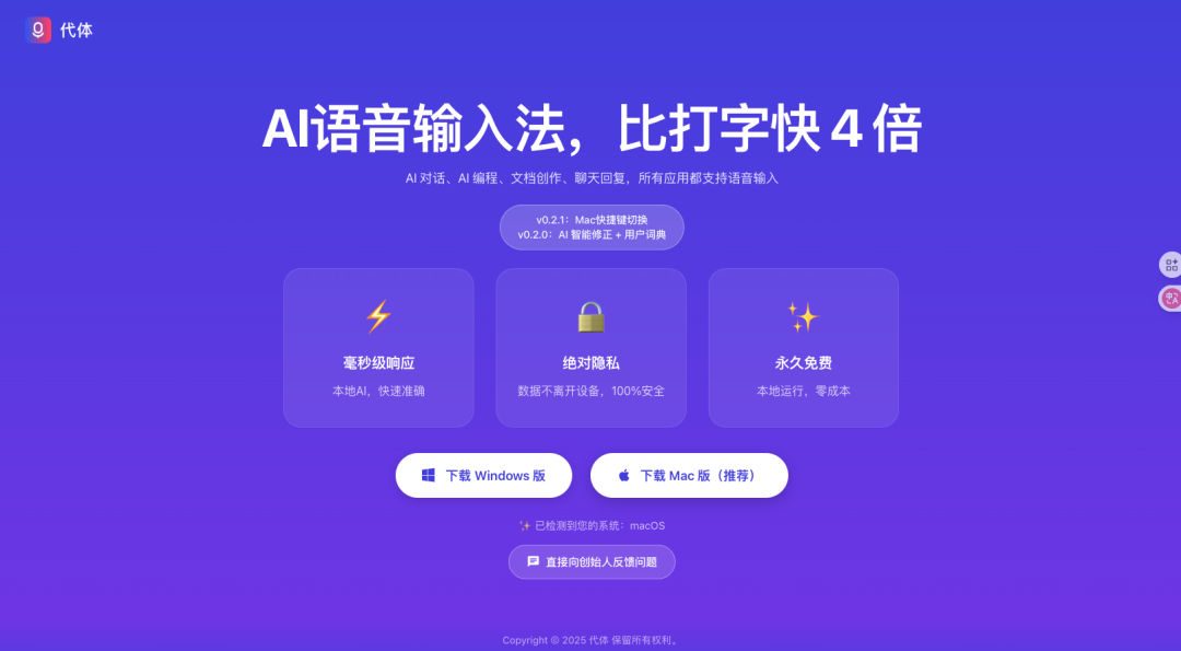 最近在有中国的 “Product Hunt ”之称的「观猹」网上看到了一个叫“代体”AI 语音输入软件。