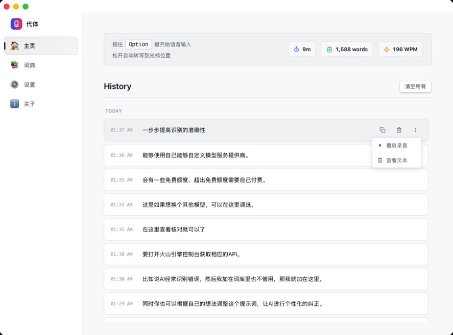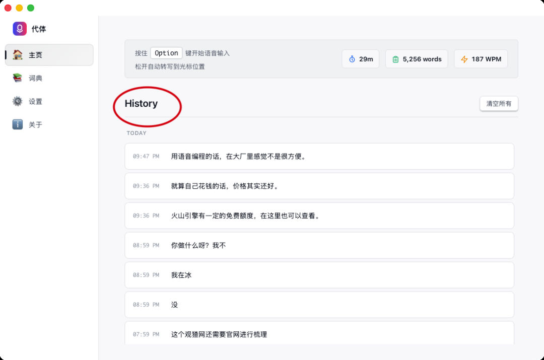 在主页可以查看输入的文本,还有输入速度之类的,然后也可以查看输入的历史播放对应的录音等。