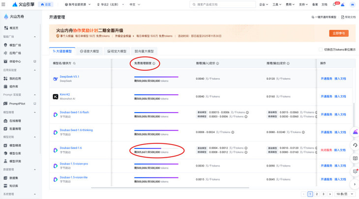 火山引擎会有一些免费额度(我这边是 50W tokens),超出免费额度需要自己付费。