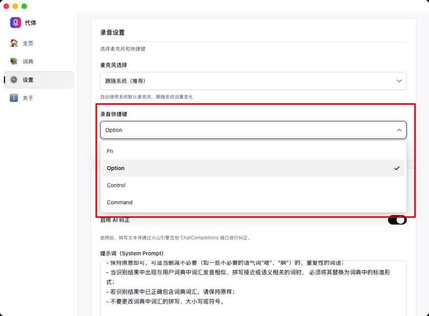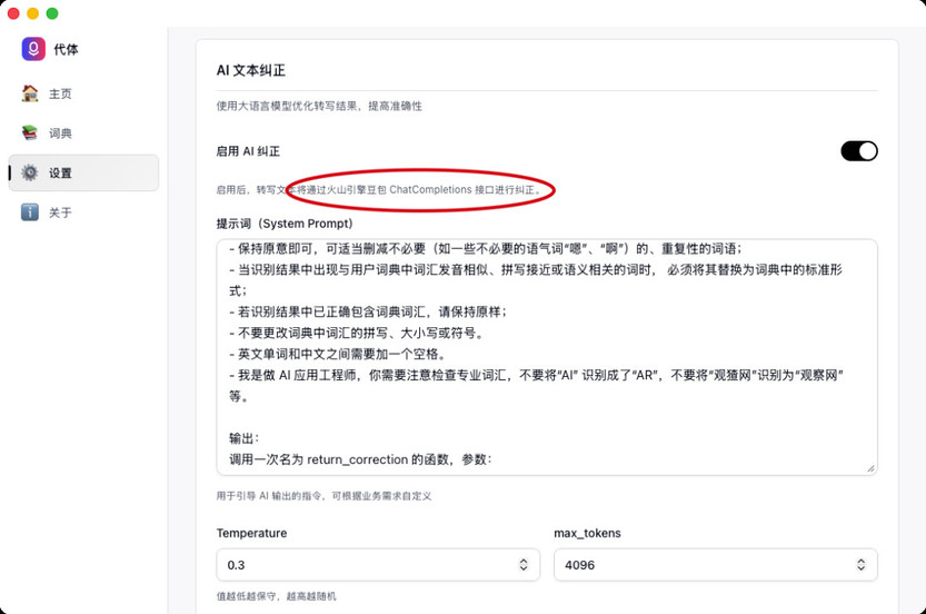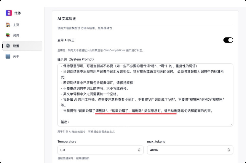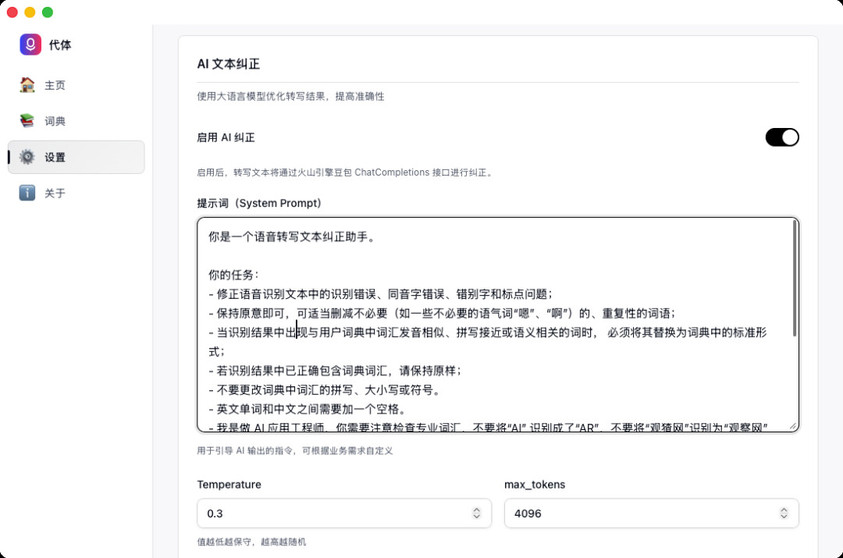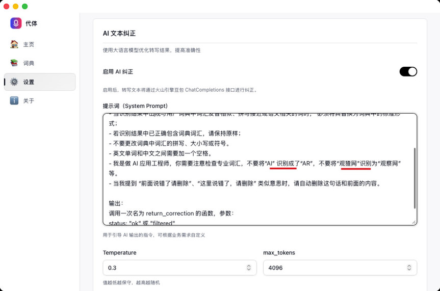 AI 文本纠正的提示词、温度、最大 tokens、模型名等支持自定义。