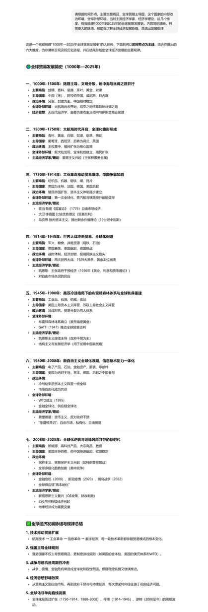 姚老师先让GPT模型梳理完整的历史事件时间线,从大航海时代的地理大发现,到工业革命的技术突破,再到现代的全球化进程和AI时代的到来。这不是简单的时间轴罗列,而是要找出每个阶段的关键转折点、核心矛盾和博弈逻辑