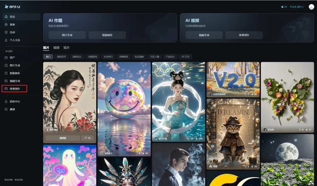回到即梦官网主页,点击左边菜单【故事创作】。